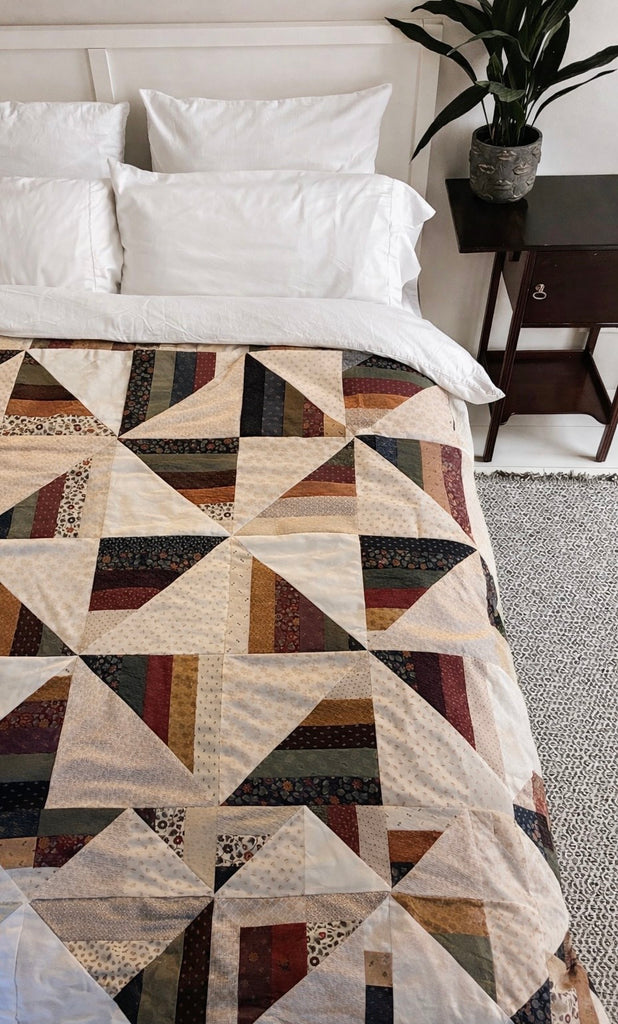 These beautiful quality Moda fabrics, make up a stunning cosy quilt, perfect to lay across the bottom of your bed, or on a single bed.